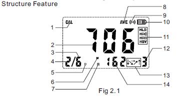 1 Calibration mode 2 Measuring value 3 Average times set 4 n th measuring value5 Impact type 6 Measuring state 7 Browsing state 8 Average Symbol 9 Measuring symbol 10 Battery indicator 11 Hardness scale 12 Material 13 Direction 14 Number of memorized data